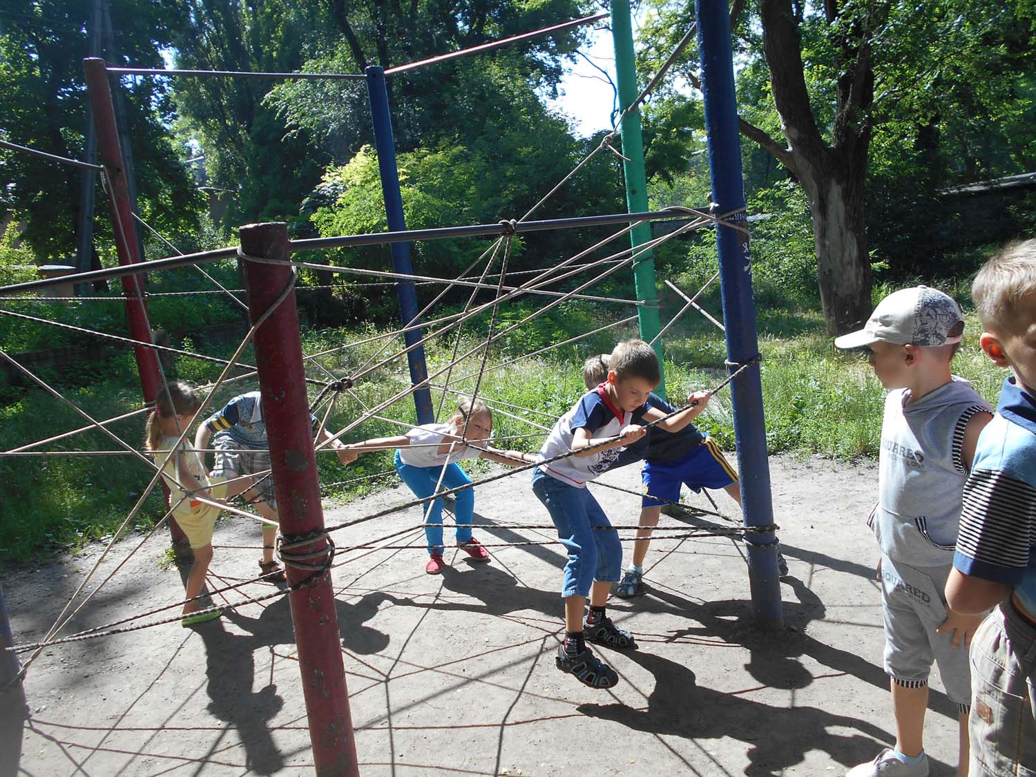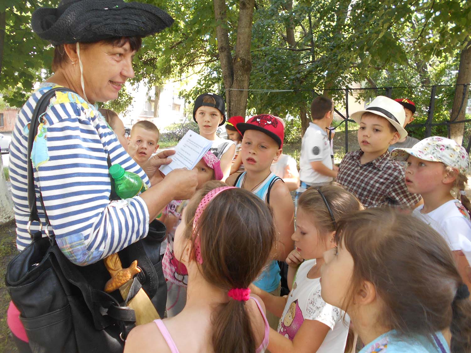 Читаєм о: «Там, де сходи на вулиці в спортзал ведуть, веселий садівник вас чекає». А ми знаємо, де сходи в спортзал і прямуємо туди. Садівник зустрічає нас дружелюбно і просить пройти чергове випробування: перенести в стаканах воду з одного відра в інше, щоб потім полити вербу. За непролиту воду отримуємо конверт. У конверті нова підказка «Павук з підказками сидить, там де дерево лежить». Кожен раз, коли ми йдемо в школу, бачимо дерево, яке вклонилось до землі і проводжає нас в табір. Біжимо туди.