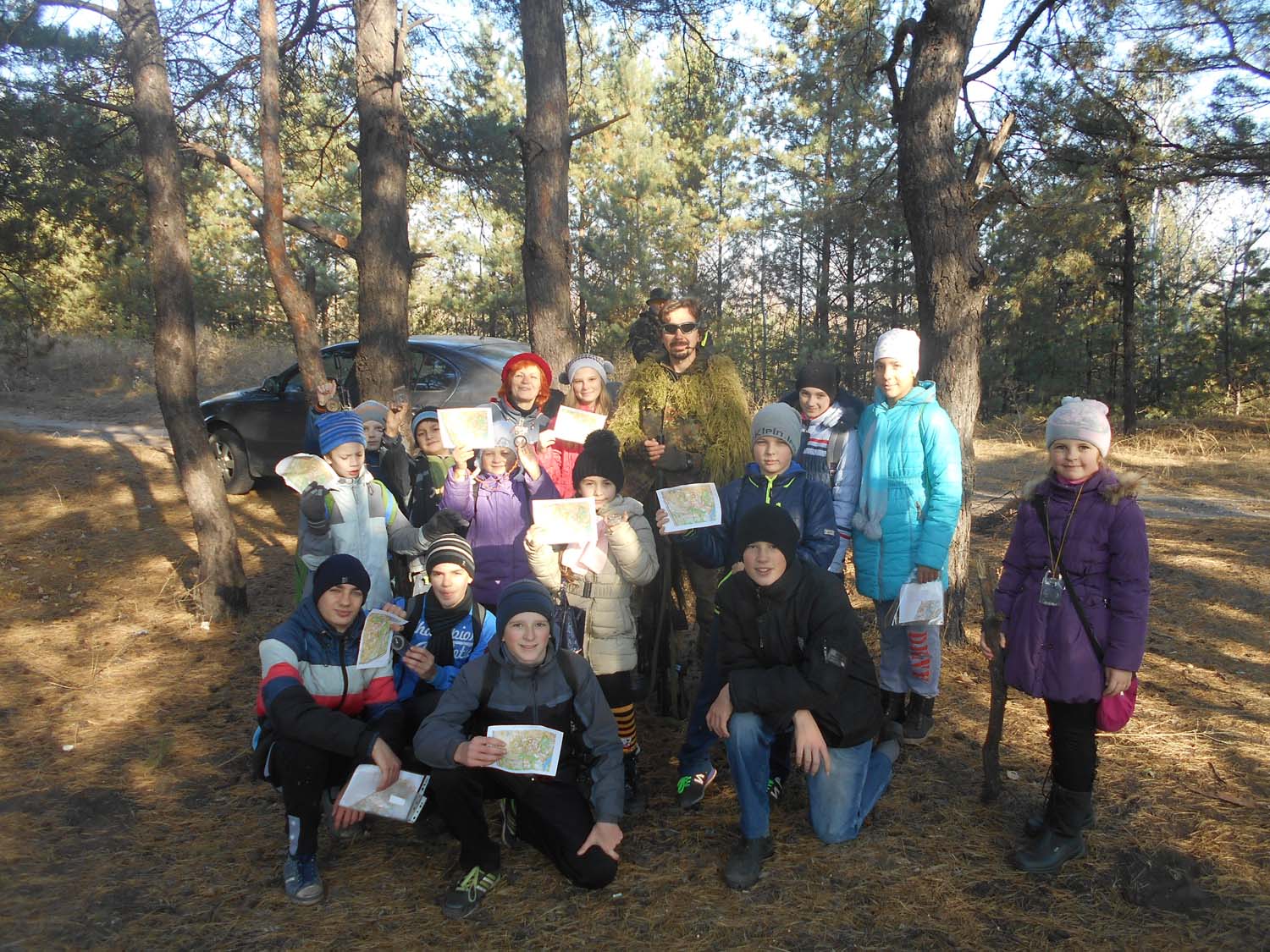 Довго збиралися і нарешті сьогодні ми виїхали в ліс потренуватися в орієнтуванні на місцевості. Перед початком тренувань нам роздали карти. Інструктора пояснили, де ми знаходимося. По стежках, зазначених на карті, ми дружно рушили до точки старту. Не обійшлося без пригод. По дорозі до старту нам зустрілася команда з пейнтболу. У них теж проходили заняття там, де у нас стояли КП. Але ми пройшли першими по точках, правильно орієнтуючись по карті. Правда на початку молодші туристи не правильно соорентіроваться і загубилися. Але потім все пройшло гладко. Після закінчення тренування ми посиділи біля вогнища, поговорили на цікаві теми. Обговорили майбутні заходи.