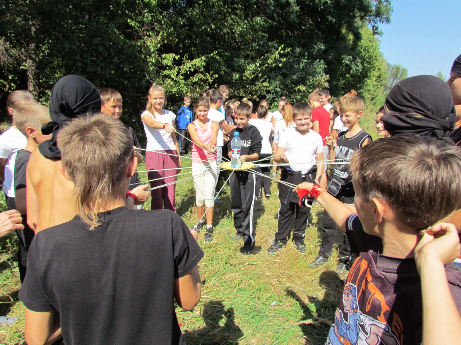 Ми об’єднуємось на 3 команди: сині, червоні, жовті. На початку інструктор з дитячого туризму та керівник гуртка Людмила Олегівна провела конкурс назви команд. Потім почалися конкурси: перенеси жучка, пройди перешкоди, переклади палички як треба.