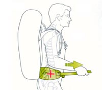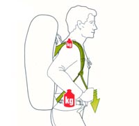 Сначала ослабьте все ремни. Наденьте рюкзак на плечи, пристегните набедренный пояс и затяните его. При этом середина набедренного пояса должна находиться на косточках бёдер, не выше, потому что иначе ремень может стянуть живот. |