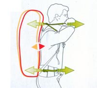 Спальный мешок, одежду и другие легкие вещи следует упаковать в нижнее отделение, дальше от спины. Тяжелые вещи следует уложить ближе к спине на уровне плеч. Мелкие вещи удобно разместить в верхнем клапане, откуда их легко достать. При такой укладке центр тяж ести рюкзака расположен близко к телу. |
